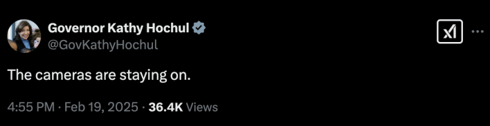 At the moment, the MTA’s lawsuit has not been assigned a judge and the agency has not gone as far as asking for a temporary restraining order on Duffy’s demand to end the toll. The Secretary’s letter mentions says that the U.S. DOT will work with its state counterparts and the MTA on the “orderly cessation” of the toll. But Hochul does not seem ready to talk about that at the moment judging by her tweet declaring, “The cameras are staying on.”