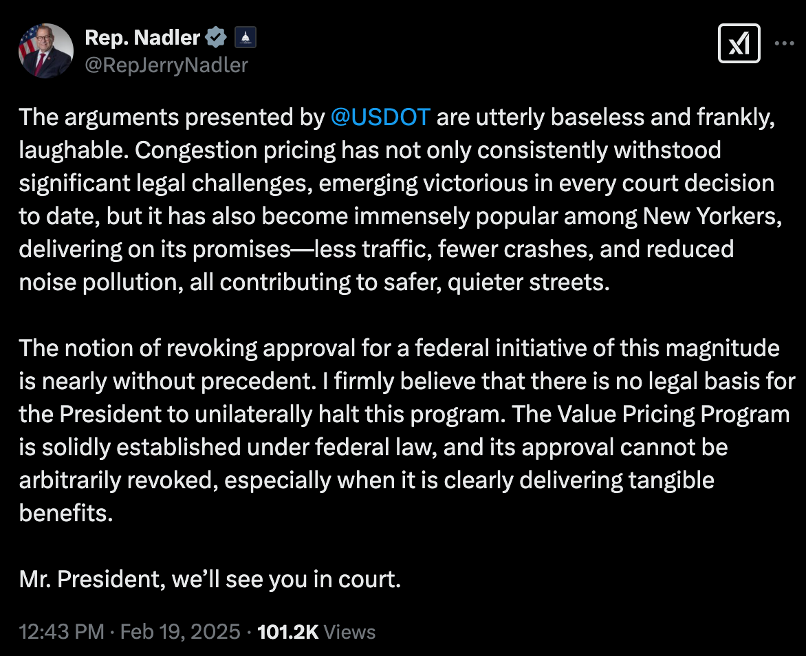“[Secretary Duffy] just said this program was actually never lawful to begin with, that no administration could have authorized it,” said Dror Ladin, an attorney at Earthjustice, which successfully sued Gov. Hochul over her decision to pause congestion pricing. “Their position is that from the get-go it never could have been authorized lawfully. And I don’t think that that is a particularly persuasive reading of the law.”