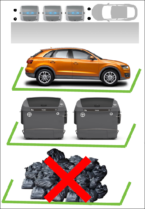 Only one bin each will be necessary for mid-size buildings and most larger buildings, occupying less than the space one car requires. The usual uproar over “parking” loss could be dampened by the fact that most building owners made the choice for the trash receptacles over vehicle storage, said Berthet.