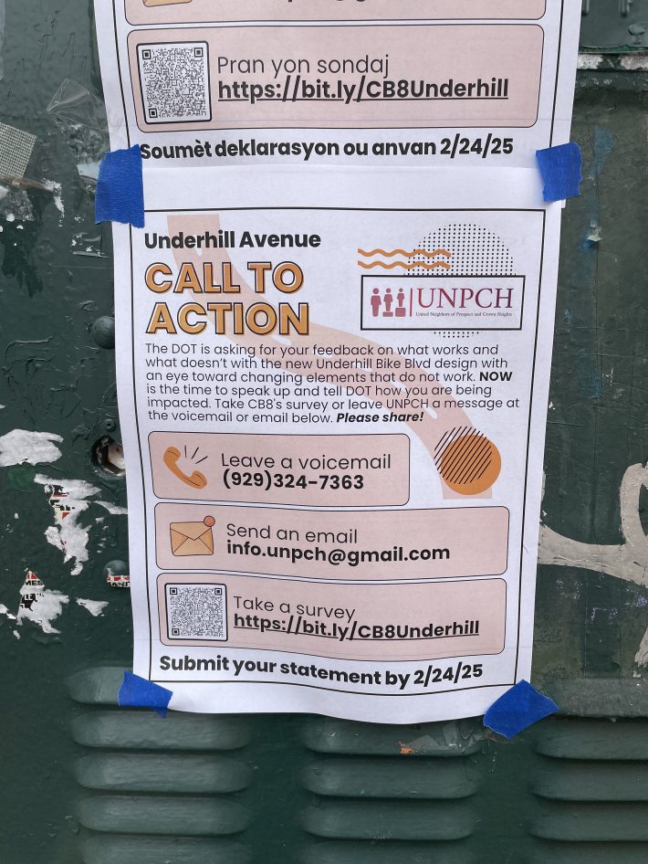After Hizzoner paused the construction of the nearly completed redesign in 2023 and ordered the Department of Transportation to go door to door to re-solicit opinions on the Underhill Avenue bike boulevard, residents said they were cool with it. The project was eventually finished in early 2024, but the results of the survey were never shared — and the Department of Transportation even rejected a Streetsblog Freedom of Information request seeking the results. (We sued, but that case is pending.)