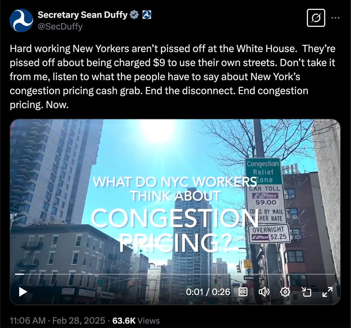 Days after Streetsblog’s expertly deployed facts for a video to correct Duffy’s misrepresentations of the toll, the secretary’s team used government resources to make its own video — doubling down on the Trump administration’s mistaken view that the toll is ineffective and a “cash grab” from “hard-working New Yorkers.”