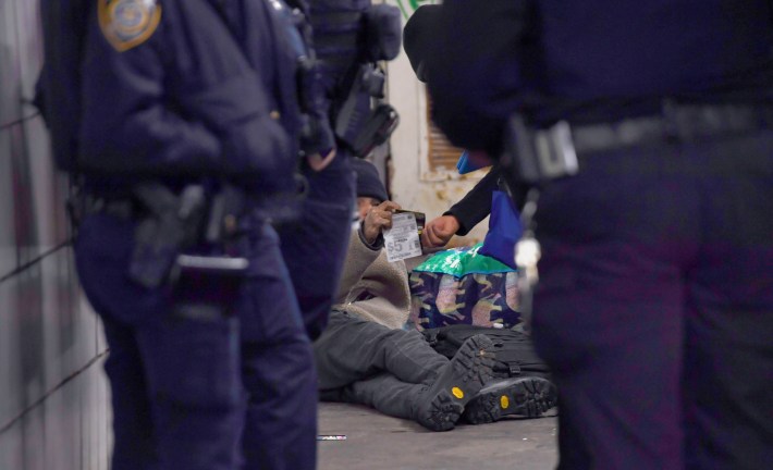 There were at least two dozen cops and two outreach teams stationed on the platforms or the mezzanines. But only occasionally did they intervene. Instead, a reporter repeatedly observed officers and social workers walking inside the train past people laid out on the seats.