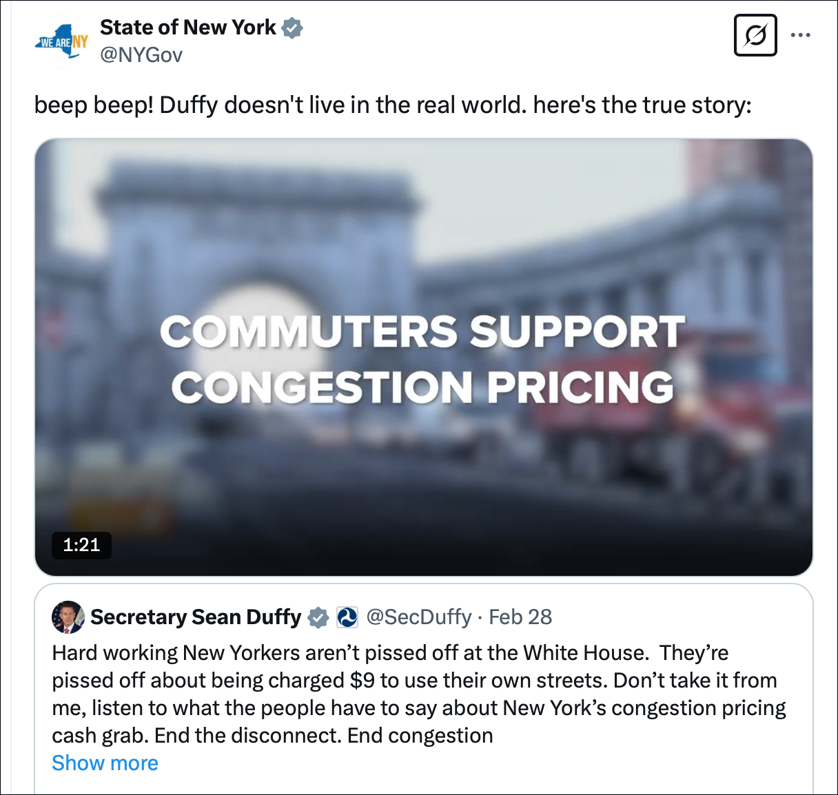 Meanwhile, Gov. Hochul went on the offensive to champion the toll, putting out a video that beautifully mocked U.S. Department of Transportation Secretary Sean Duffy’s earlier version decrying the toll as a tax on the working class. (We can’t embed tweets because our platform is lame, so click the picture below to watch the state’s official takedown of Duffy.)