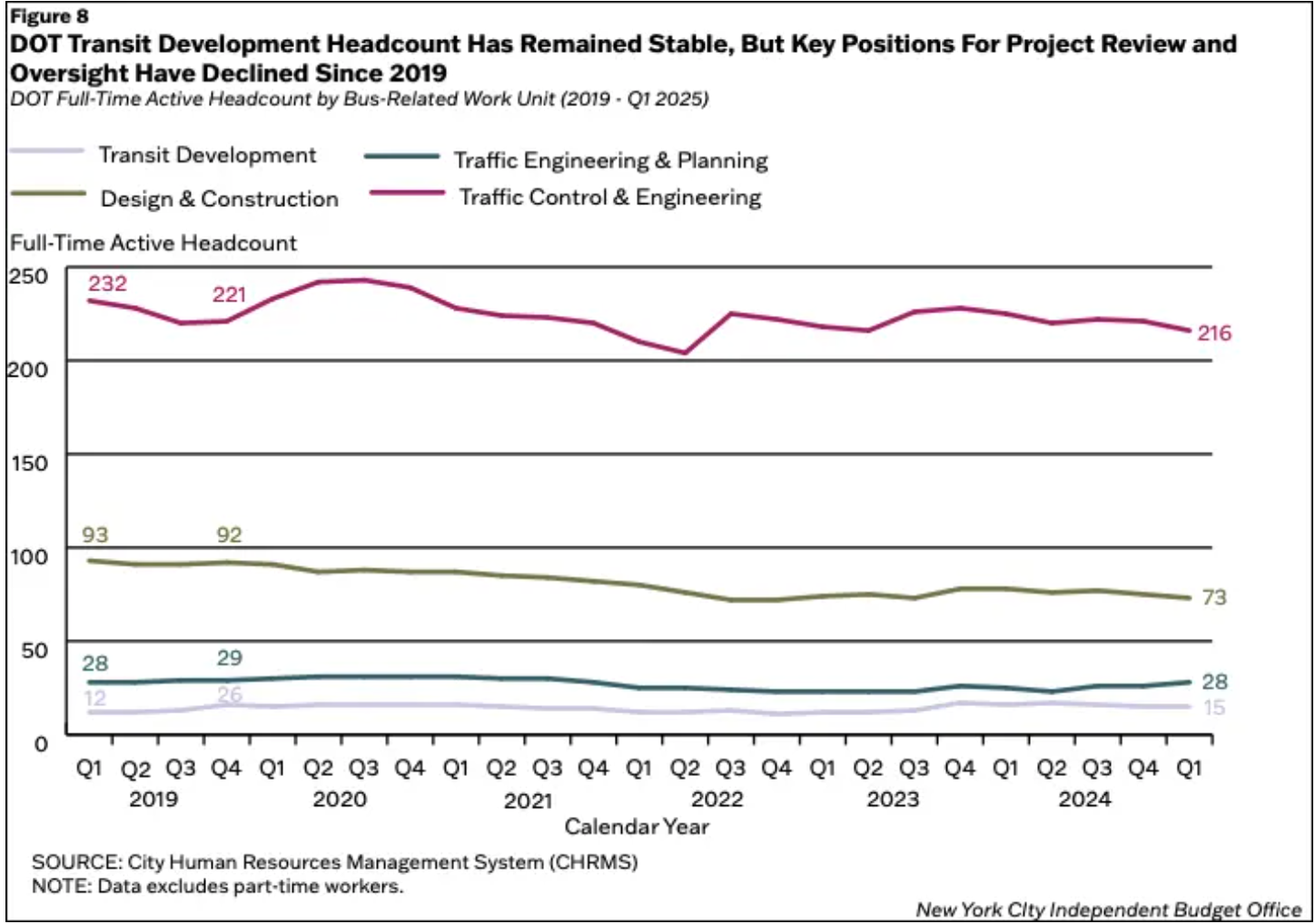 But on Thursday, the agency finally acknowledged that officials struggled with staff shortages at DOT’s Division of Transportation Planning and Management. DOT could have simply read last month’s report by the Independent Budget Office, which noted that every key division inside the DOT for creating new bus lanes had shrunk since 2019.