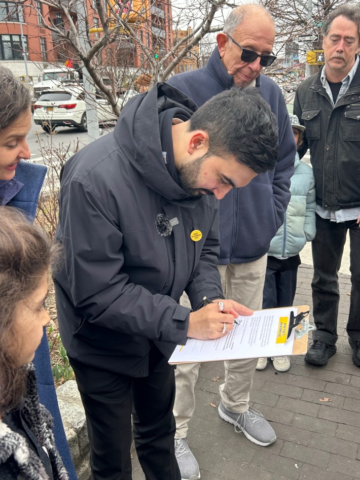 - We would be remiss if we didn’t update you on our recent story about a new push to get mayoral aspirants to pledge to finish the safety redesign on McGuinness Boulevard. Since our first story (about Brad Lander), candidate Zohran Mamdani has also signed, with more expected. Here’s a picture of Mamdani putting his John Hancock on the pledge: