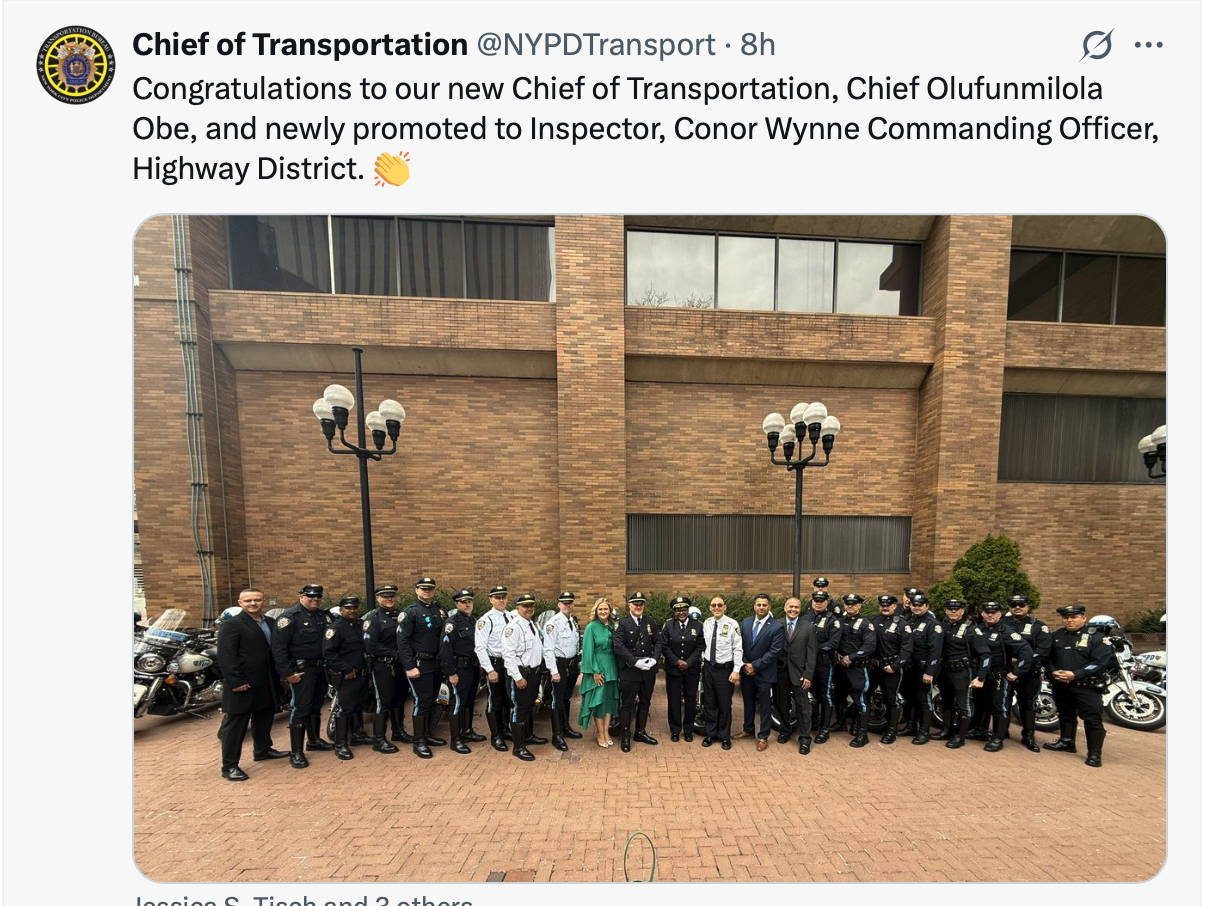 On Friday, Tisch promoted Chief of Training Olufunmilola “Lola” Obe to the all-important job of chief of the NYPD’s Transportation Bureau — and, in doing so, suggested that maybe she sees the typically auto-centric division as ripe for change.