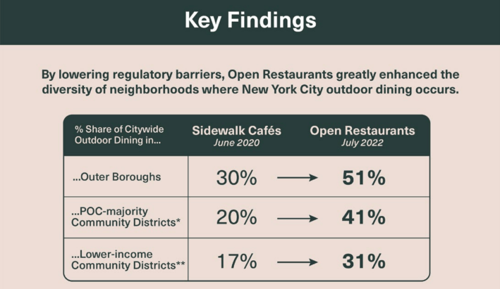 “This is a regulatory nightmare,” said one of the report’s co-authors, Mitchell Moss, a professor of urban policy and planning at NYU, of the new program. “This is one of the few good things that came out of the pandemic. We’ve rediscovered that New York can make the outdoors work right.”