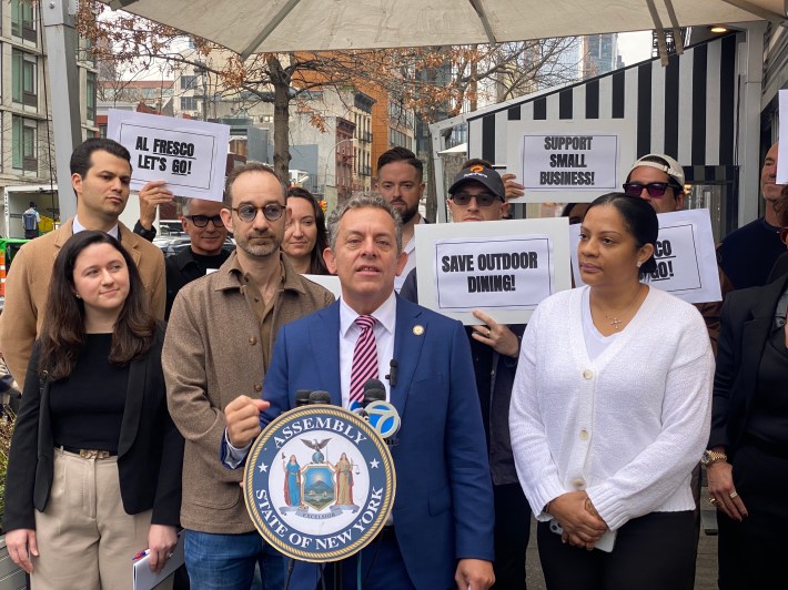 Assembly Member Tony Simone (D-Manhattan)’s bill would outlaw the city’s “stupid” December-to-March ban on al fresco roadway set-ups, he said at a press conference on Monday.