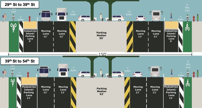 A DOT spokesperson did not deny the delay until next year, and said the agency would collect more “feedback.” The official also pointed to a separate project Hamilton Avenue and Third Avenue, where the city is adding a two-way bike lane to an expanded sidewalk as part of the Brooklyn waterfront greenway. That redesign ends at 29th Street, where cyclists divert onto Second Avenue, and does not reduce the number of car lanes on Third Avenue.