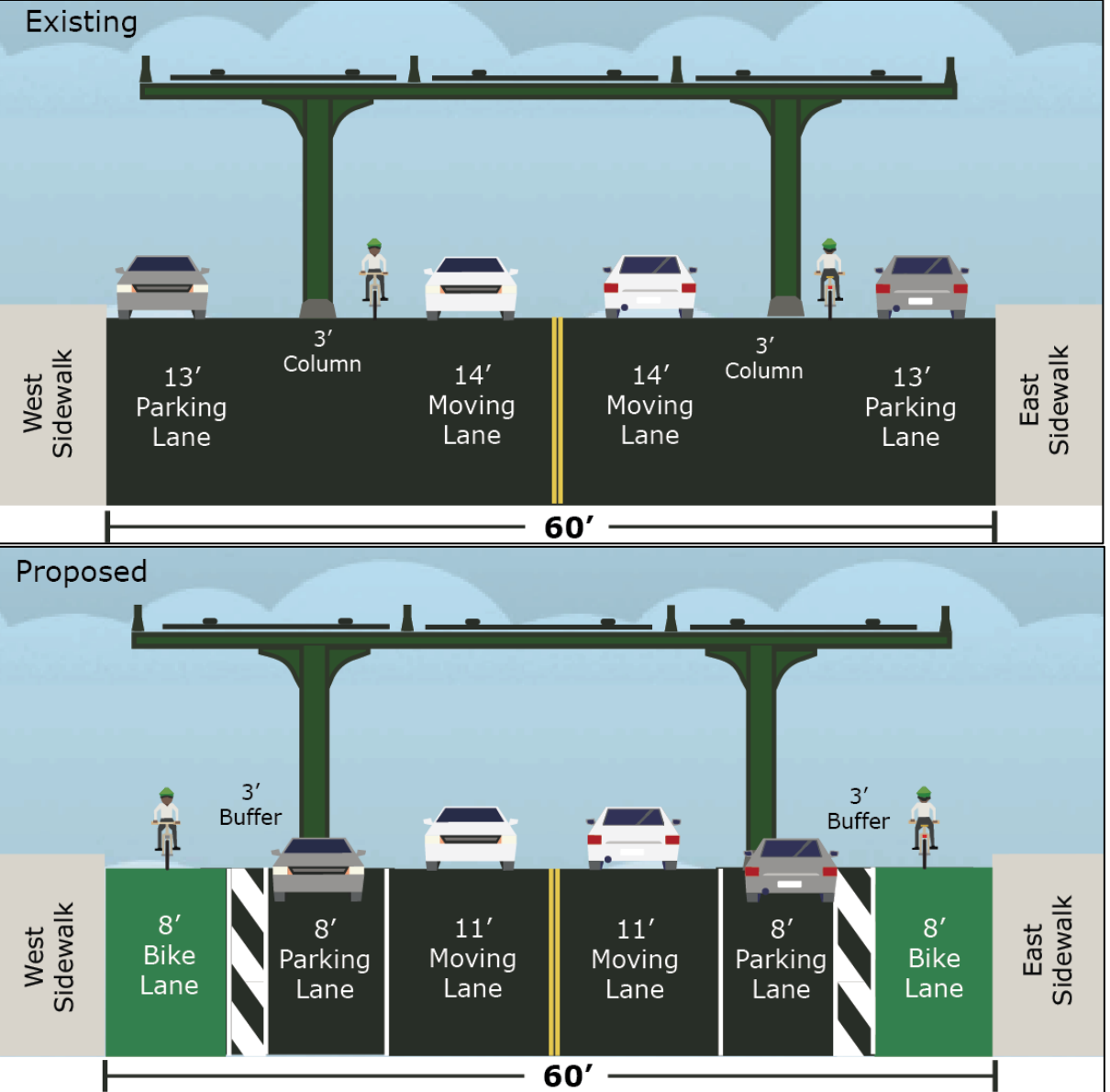 The plan does not remove any of the driving or parking lanes, but organizes the car storage space to be in line with the columns and adds a wide eight-foot bike lane and a three-foot buffer alongside each curb: