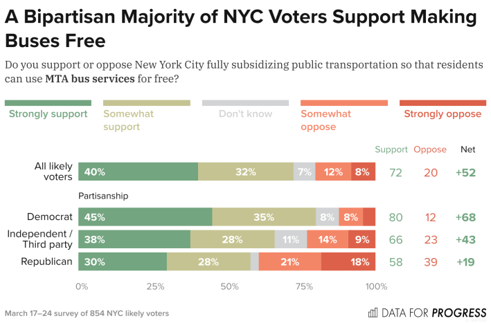 Fare-free bus service polls as well as free ice cream among all New York City voters, according to polling firm Data for Progress, with even a healthy majority of Republican voters supporting the idea.