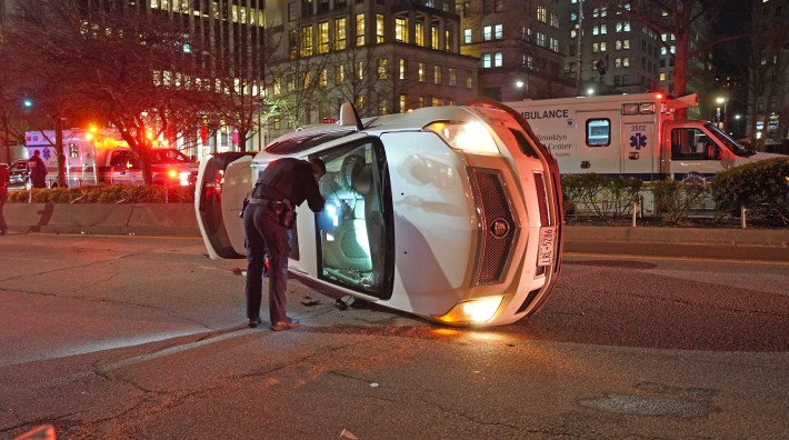 - And, finally, a friend of ours in Brooklyn Heights sent over this photo of a car flipped on its side on Boerum Place near Fulton Street. We ran the plate — the car has been nabbed so many times for speeding (nine since October!) that one needn’t wonder how it ended up on its side. The main question is why we allow drivers to speed so recklessly and then wonder why these “accidents” happen: