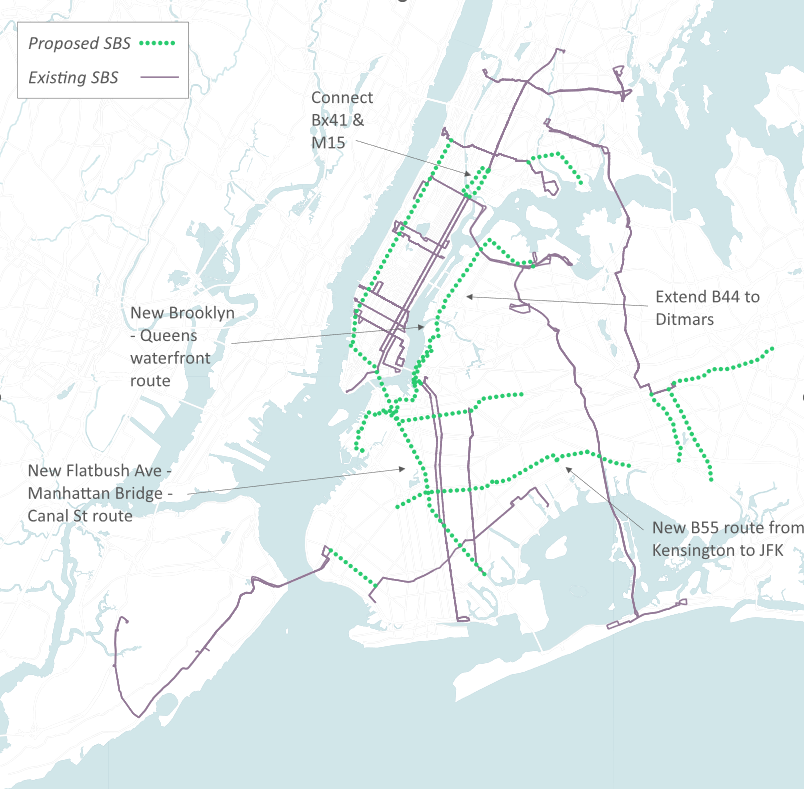 “MTA and NYC DOT should collaborate to revive and implement all 20 SBS routes originally proposed in 2009 and create new inter-borough connections by extending SBS routes across bridges and between boroughs,” Lander’s report said. “Specific connections to prioritize include creating a new SBS route along the Brooklyn-Queens waterfront and upgrading the B55 to an SBS route between Kensington and JFK Airport.”