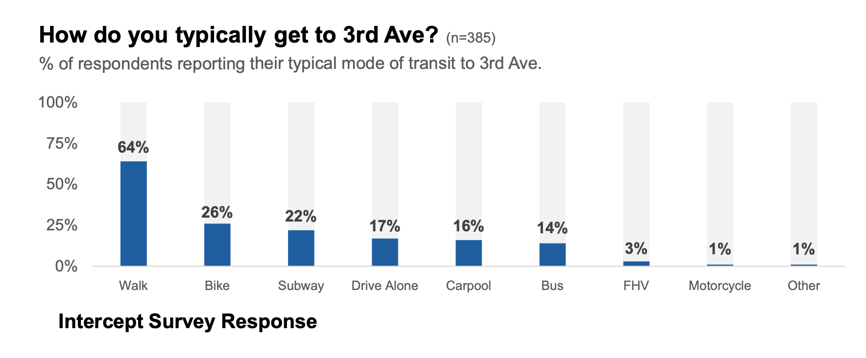 Despite the Third Avenue’s “Mad Max”-style design, an overwhelming number of people still get there without a private vehicle, according to another survey by DOT.