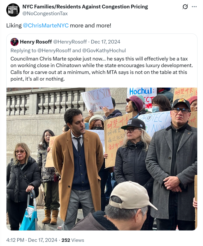 As a neighbor and constituent, I repeatedly encountered Marte’s toll naysaying. I tried to impress on him that the terms of his support — carve-outs for residents — would shackle congestion pricing and were abetting objectors around the city and region. After all, if the district with the most to gain wasn’t solidly for it, why should areas that stood to gain less lend their support?