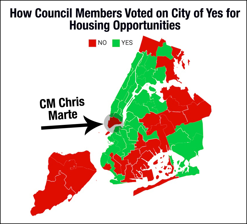 City of Yes passed the council by an unusually tight 31-20 margin, and was watered down to appease opponents like Marte. That’s another red X next to Marte’s name.