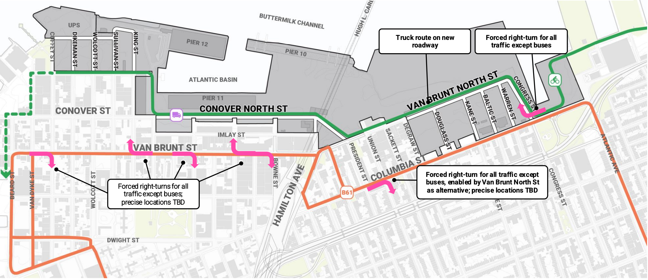 The EDC’s plans also propose diverting truck traffic off the main streets to new roads currently inside the port, and directly onto the BQE at Hamilton Avenue, while building out paths for smaller delivery vehicles like cargo e-bikes.