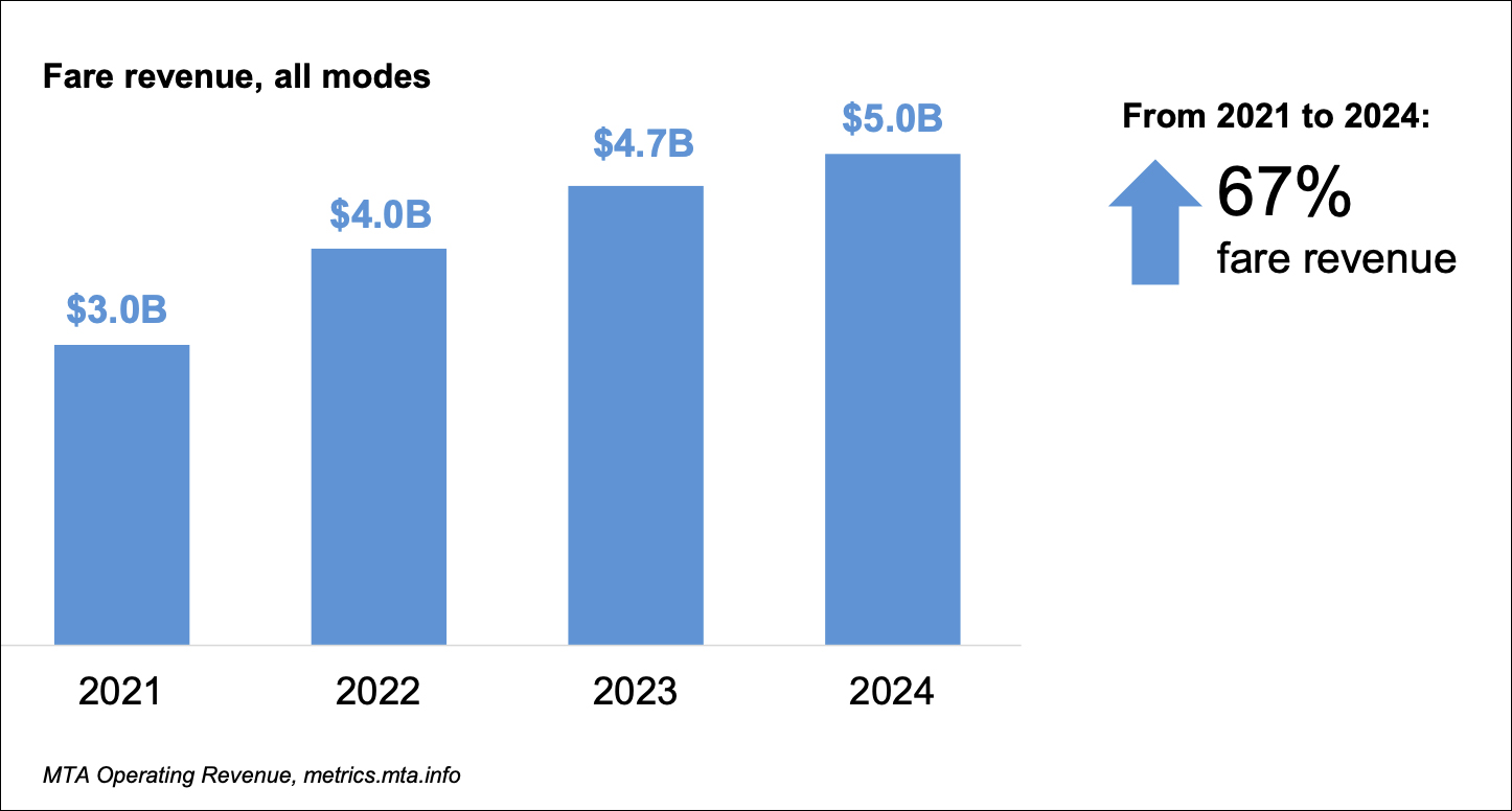 Since 2021, riderships across all modes that the MTA offers has steadily risen from 100 million rides per month to over 150 million rides per month, for a total of 6 million rides per day across the system.