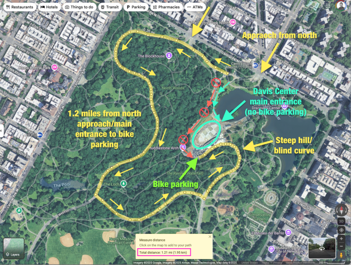 Recently, the department announced it would ban bikes from a large chunk of the Rockaway Boardwalk, that it would be closing a part of the Hudson River Greenway for yet another one-off sinkhole repair job, and that it would welcome vehicle traffic back into a Staten Island park where cyclists have been enjoying car-free bliss since the pandemic. And now, Harlem Cyclists will have to wait to truly access the new Davis Center by bike.