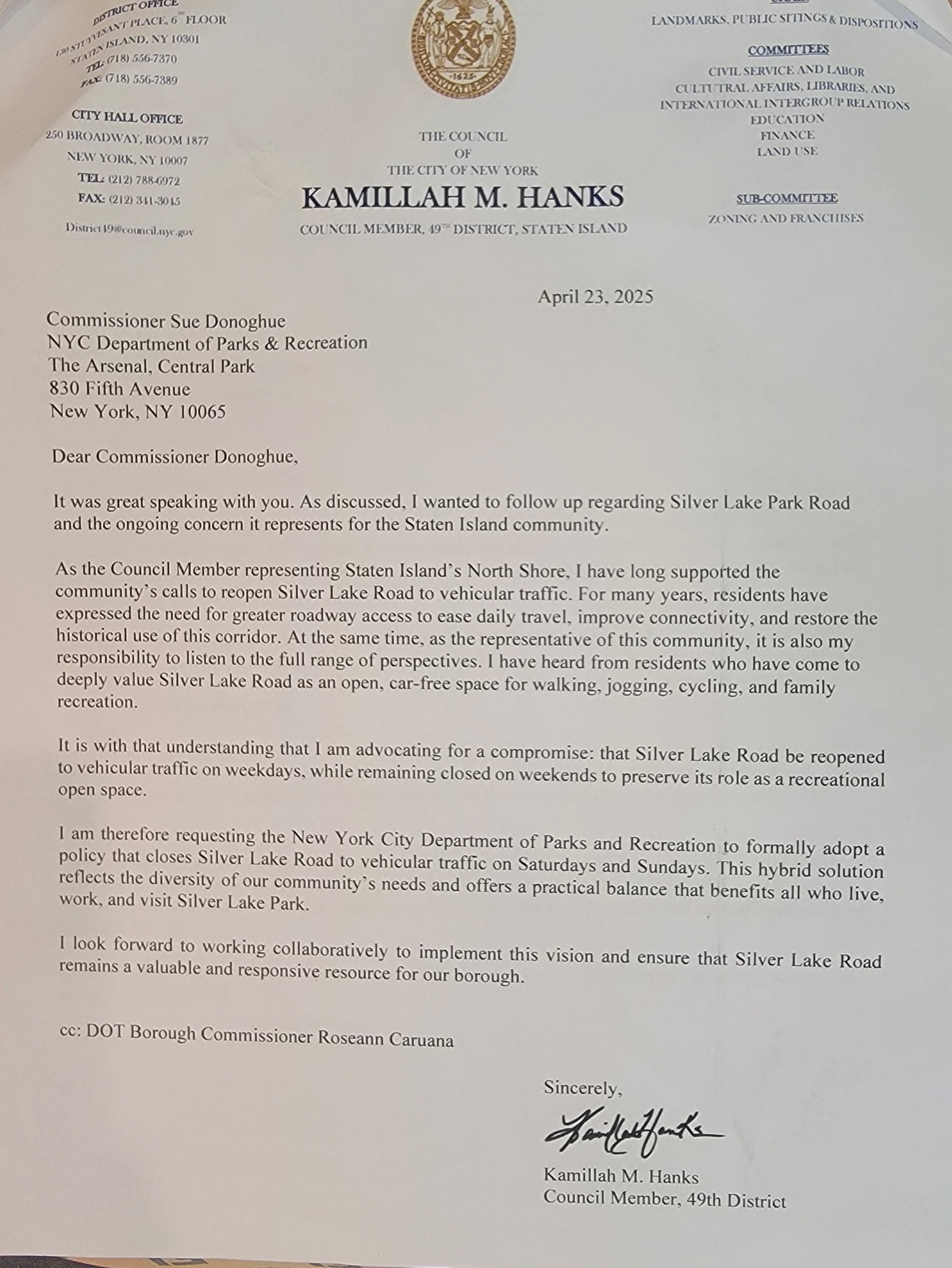 historical use of this corridor,” Hanks wrote in a April 23 letter, a copy of which Streetsblog obtained. “At the same time … I have heard from residents who have come to deeply value Silver Lake Road as an open, car-free space for walking, jogging, cycling, and family recreation.”