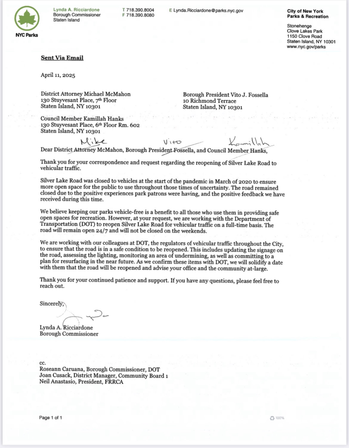 “By evicting recreational users from Silver Lake Park Road, the Parks Department rendered a designated protected bike lane unusable, tore down 17 adolescent and mature trees (in a park to make way for cars), and robbed the community of an accessible recreational space for people with disabilities, including people who use wheelchairs, walkers, and other mobility devices,” the group of residents wrote to the Parks Department on April 30.
