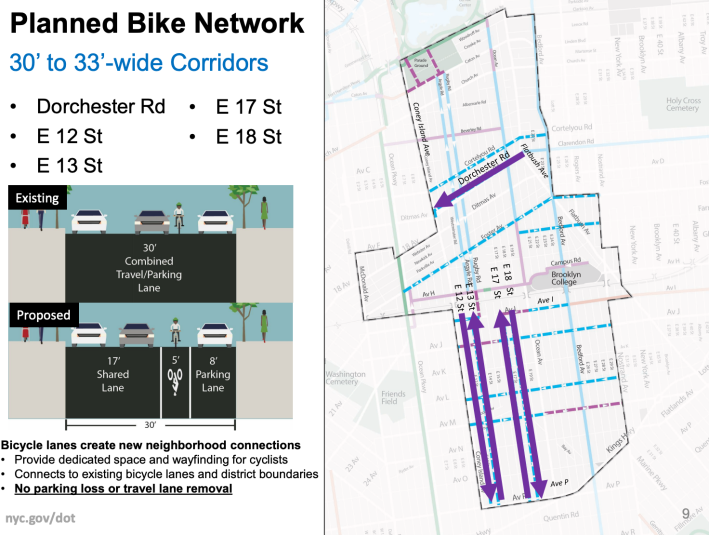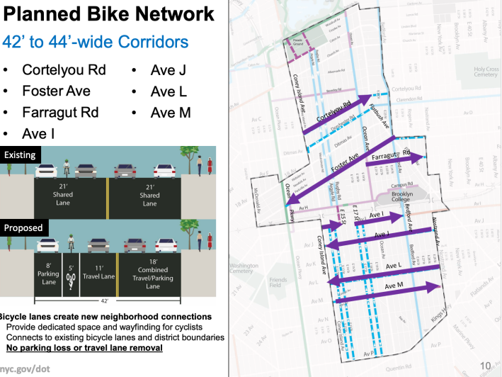 The proposed project would have added painted lanes on the one-way streets (Dorchester Road, East 12th Street, East 13th Street, East 17th Street, and East 18th Street) and on one side of two-way Cortelyou Road, Foster Avenue, Farragut Road, Avenue I, Avenue J, Avenue L and Avenue M. None of the work requires the DOT to repurpose any street parking.