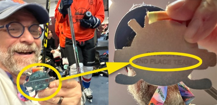 - And, finally, let’s close the circle on my three-day, five-game old fogey hockey tournament that I mentioned yesterday: my team, The Freddie Mercuries, lost 4-1 in the championship game to the David Bowies. As you can see, all that glitters isn’t gold: