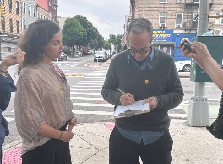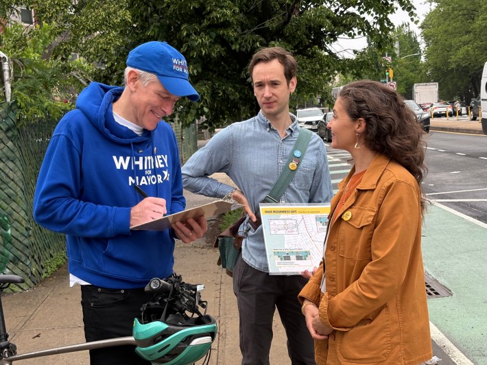 - And, finally, two more candidates for mayor have signed the pledge to finish the McGuinness Boulevard safety program that Mayor Adams half-assed. As of Monday, Democrat Whitney Tilson and independent Jim Walden have joined Brad Lander, Zohran Mamdani, Michael Blake, Scott Stringer and Jessica Ramos in making the pledge. Here are the latest pictures to prove it: