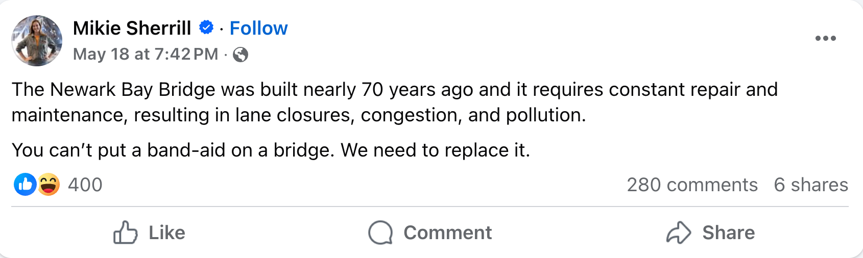 Sherrill, the current Democratic frontrunner, supports Phase I of the project, replacing the Newark Bay Bridge:
