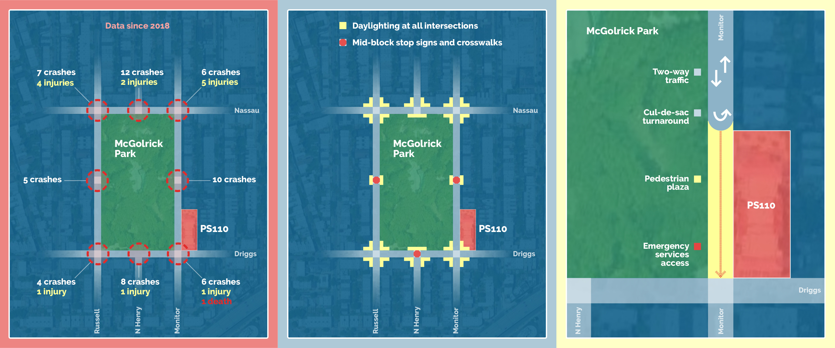 DOT should also create mid-block pedestrian crossings around the park, which already has entrances to the green spaces there, and ban parking at all corners around it to increase visibility for all street users, a design known as daylighting.