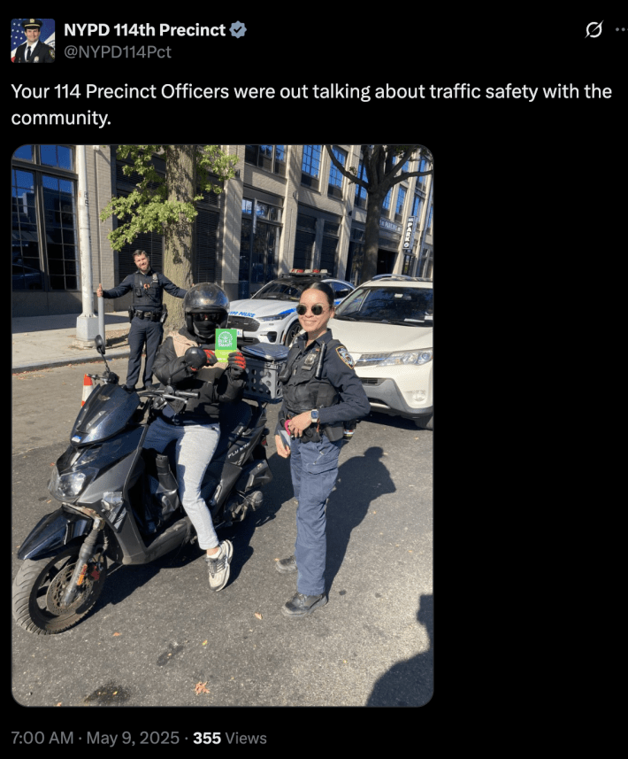 And on X, the 114th Precinct posted a photo of a moped rider holding up a “Bike Smart” pamphlet from the Department of Transportation, which is meant to be shared with cyclists. The pamphlet, if followed by a moped rider, would be encouraging illegal behavior, considering mopeds are not even allowed in bike lanes. The NYPD also declined to comment on the incident.