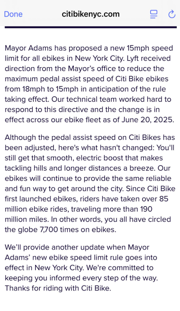 But that was not at all true. In fact, the reduction in Citi Bike top speeds from 18 to 15 miles per hour occurred days after Deputy Mayor Randy Mastro wrote a letter to Citi Bike demanding the change, citing an alleged “public health emergency” from 18 mph electric bikes.