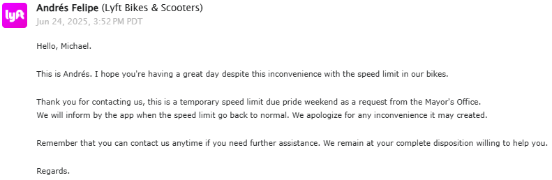 “We will address any misinformed customer service responses to ensure that riders are aware of this new pedal-assist speed limit.”