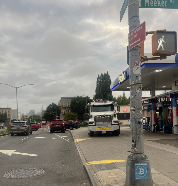 “They haven’t put any sort of markings about what you’re supposed to do to get from Meeker onto McGuinness Boulevard,” said LaBorde, adding that when she asked the DOT what cyclists should do when trying to go from Meeker to northbound McGuinness, she was told that they should to ride on the sidewalk for the half block before the bike lane starts. (There are no signs that suggest that, and car and truck drivers frequently use the sidewalk to access the adjacent gas station or just to park.)