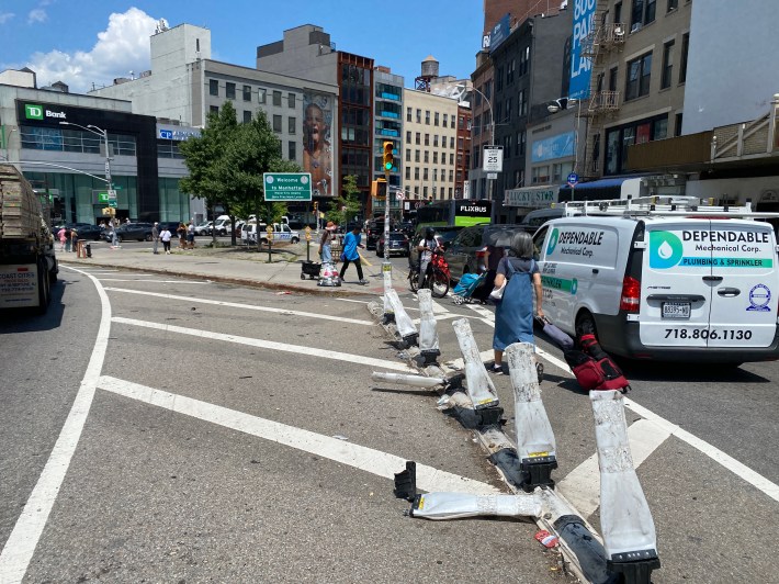 It’s easy to see why these collisions keep happening by design. There is just one proper bollard at the northern end of the triangular plaza, but little else beyond a row of destroyed plastic flappers.
