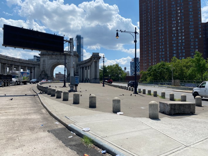 Meanwhile across the street, there are rows of cement bollards and a boulder, protecting a space at the bridge entrance that nobody uses.