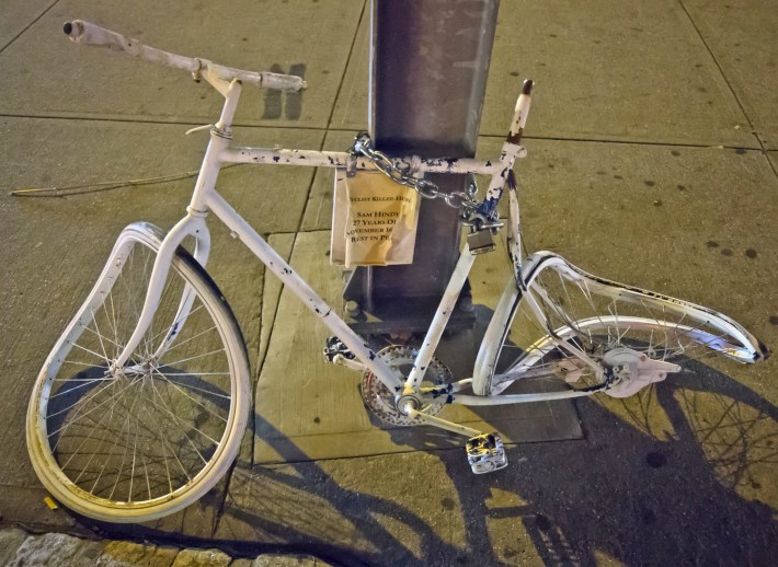 There used to be a ghost bike at that intersection commemorating the 2007 death of Hindy on the Manhattan Bridge, but drivers kept ramming into it, according to longtime safe streets advocate and author Jessie Singer.