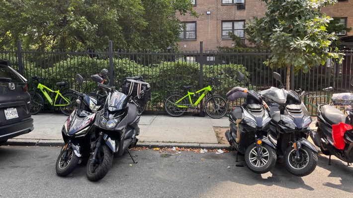 Hundreds of delivery workers live at Ebbets Field and store their bikes and mopeds outside, according to PopWheels. Management has put up signs warning residents not to charge batteries inside, but struggled to enforce that rule in the 1,300-unit complex.