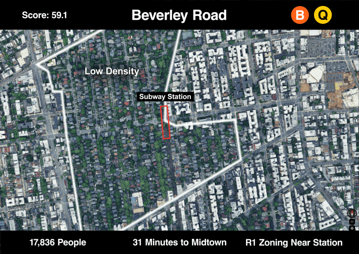 Back in Ditmas Park, the outlined area in the photo below shows how many low-density, tree-lined streets are near this subway stop compared to the white-roofed apartment buildings in the denser northeast. More apartment buildings near this station would be good for the rest of the city’s renters.
