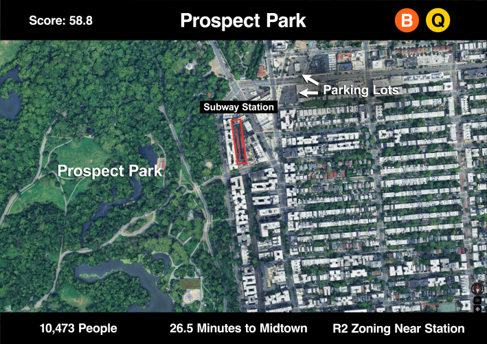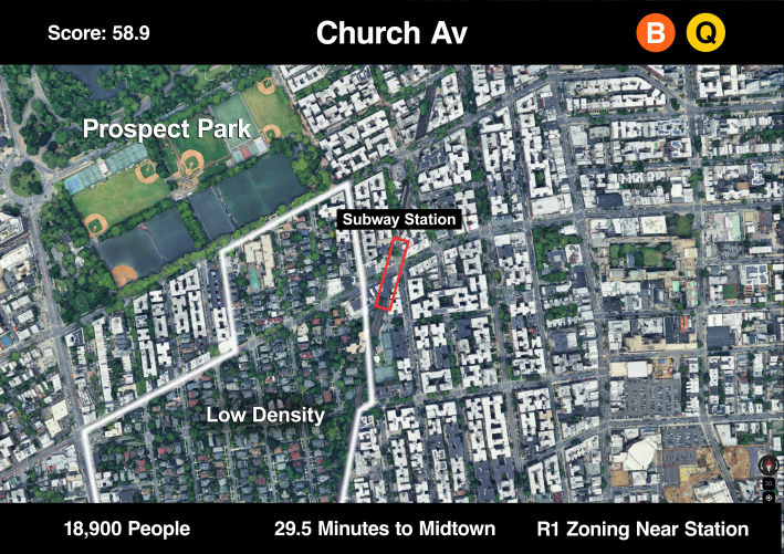 As the subway gets closer to Prospect Park, the inclusion of park-space inflates the score of this station. There is also still lots of nearby low-density housing, but in a city that often lacks park space, we should be looking to build more homes near the parks that already exist.