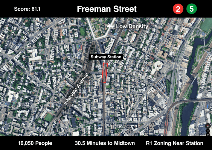The Freeman Street station has a similar story to 174th Street above. Intervale Avenue on the left is a residential street with some three-story apartment buildings, but also many small duplexes with driveways. There is no good reason more people can’t live on streets like these that are just feet from a subway station.
