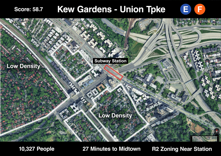 The Kew Gardens station shows up on this list because of the massive highway interchange to the northeast and because of the low density housing to the south and west of the station. Perhaps the Jackie Robinson Parkway, which runs under Queens Boulevard, could be capped and replaced with some apartment buildings.
