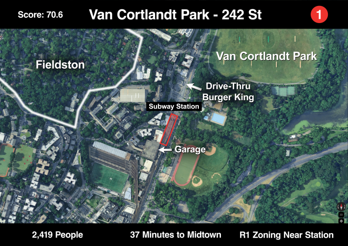 This station has the lowest nearby population (2,419) of any station in this list, partly because of the geography of the area: Van Cortlandt Park is to the east and there are steep hills to the west. Right around the station, though, are low-density commercial buildings and a large garage. Just up the hill is the privately owned, suburban neighborhood of Fieldston — which contributes very little to the density of the neighborhood — although it’s probably impossible to change that due to its status as a historic district.