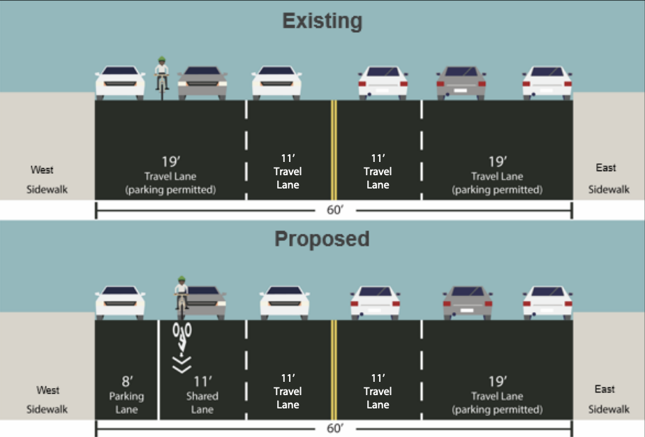 The redesign then routes cyclists onto Broadway, an extra-wide four-lane road where DOT plans to add paltry “shared lane markings” to indicate that drivers must share the westernmost southbound lane with cyclists.