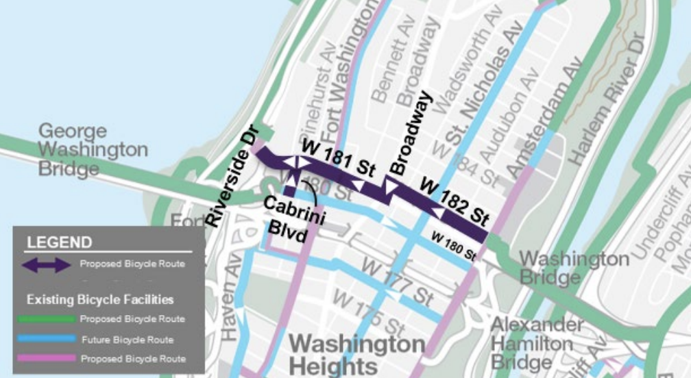 On the last block of 181st before Riverside Drive, the city plan would again put down painted bike lanes in either direction. Cyclists headed to the George Washington Bridge’s north sidewalk would get a contraflow path on Cabrini Boulevard between W. 181st Street and W. 180th Street.