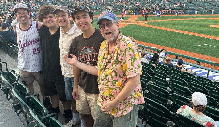 - And, finally, it was Intern Night at Maimonides Park, where Streetsblog's Summer Specialists (from left) Jonah Schwarz, Matthew Sage and Yoshi Omi-Jarrett were feted by Deputy Editor David Meyer (far left) and your aging life-lesson-dropper. The Cyclones fell to the Blue Claws, 7-4, but a splendid time was had by all (except for starting pitcher Brendan Girton, who pitched a clean first inning, but then vomited repeatedly on his way back to the dugout in the thick 90-degree heat. Here's hoping the hurler has a speedy recovery and can keep his pitches, and other things, down).