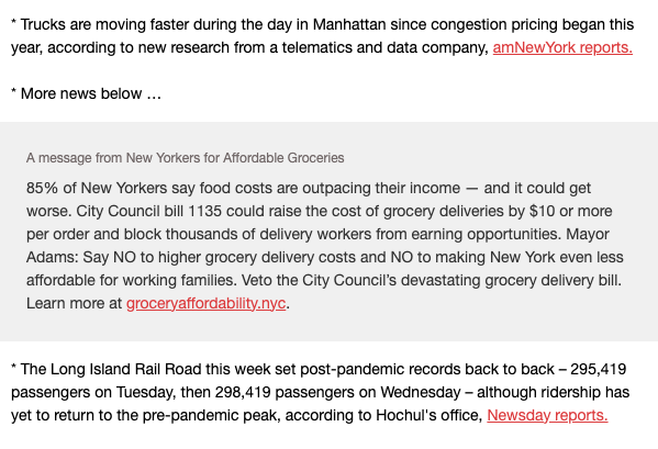 One ad that has been running in the City and State “First Read” newsletter, urges New Yorkers concerned about grocery prices to tell the mayor to veto the bill. The ad doesn’t say anything about Instacart, instead it shows up as “a message from New Yorkers For Affordable Groceries” (small print on that website reveals it is paid for by Instacart).