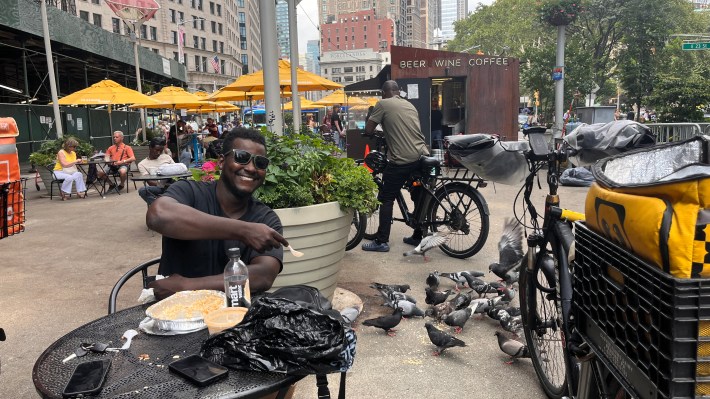 On Broadway between 22nd and 23rd streets, Mamadou Saliou Barry and some fellow delivery workers set up in a shady spot to eat lunch and feed the pigeons.