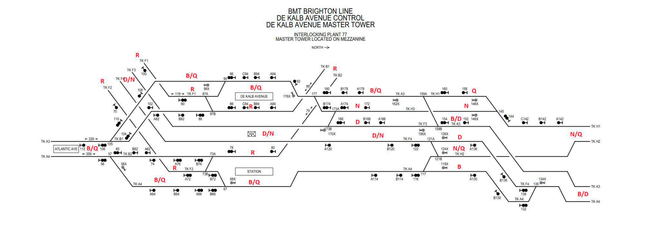 At the DeKalb interlocking, trains are thrust into a complicated dance that inevitably slows them to a crawl. Manhattan-bound Q trains have to merge with tracks that also carry N trains, and cross tracks carrying the D train to the south side of the bridge. Brooklyn-bound B trains need to cross tracks carrying the N train, and merge onto tracks carrying the Q train. Here’s a chart; try not to go crazy while you look at it.