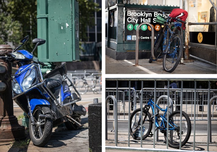 Three more bicycles and a moped — the tools of the city’s delivery workers — are also chained up and seemingly abandoned outside the federal immigration courthouse. Streetsblog has noticed and documented them over the last three weeks.